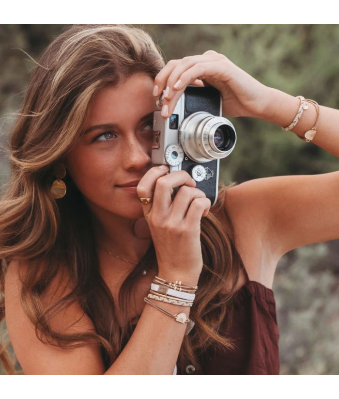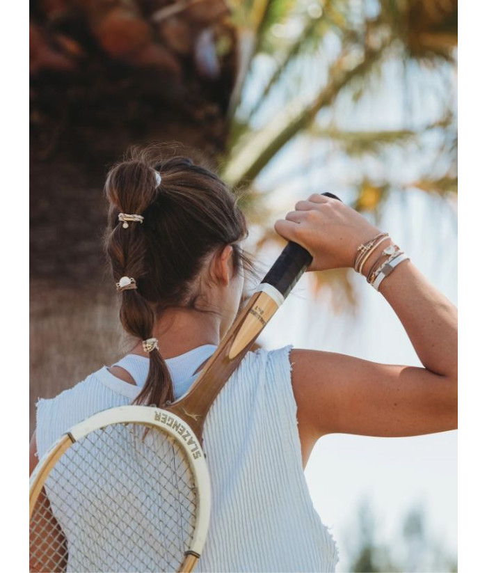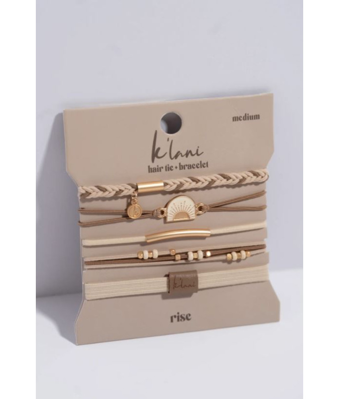 Le coffret RISE comprend cinq bracelets pouvant servir d'élastiques à cheveux, déclinés dans des tons neutres chaleureux et des touches dorées et crème, qui s'accorderont avec toutes vos tenues. Le charm « lever de soleil » nous rappelle de nous lever et de briller à chaque instant.