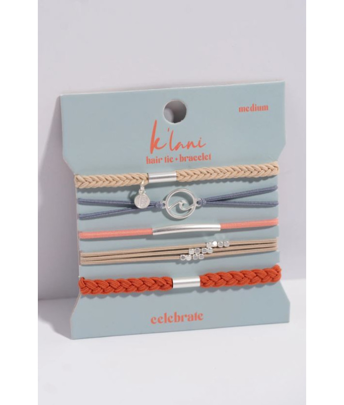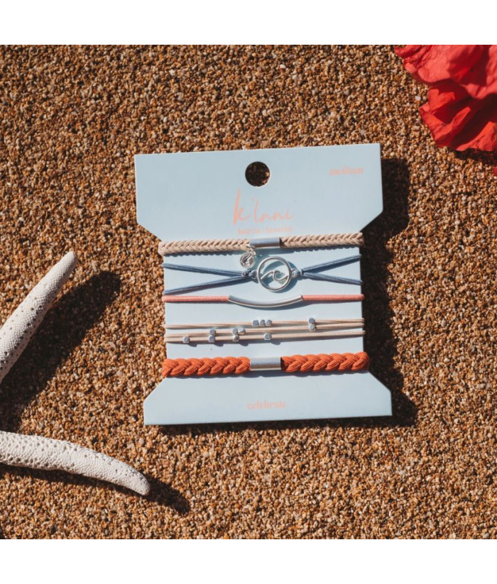 Le coffret CELEBRATE comprend cinq bracelets qui font également office d'élastiques à cheveux, déclinés dans des couleurs inspirées de la plage : bleu océan et corail. Le charm vague argenté est le symbole idéal pour célébrer nos vagues du quotidien.