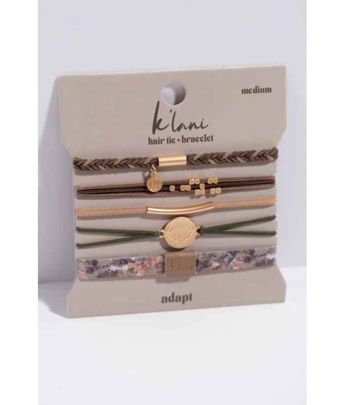Le coffret ADAPT comprend 5 bracelets élastiques à cheveux aux tons neutres et naturels, dont un orné d'un motif camouflage tendance et audacieux. Il est rehaussé de breloques dorées et de détails en bois de cerf. L'ensemble Adapt est synonyme de force et de résilience : un rappel pour rester ancré, flexible et prêt à affronter toutes les épreuves.