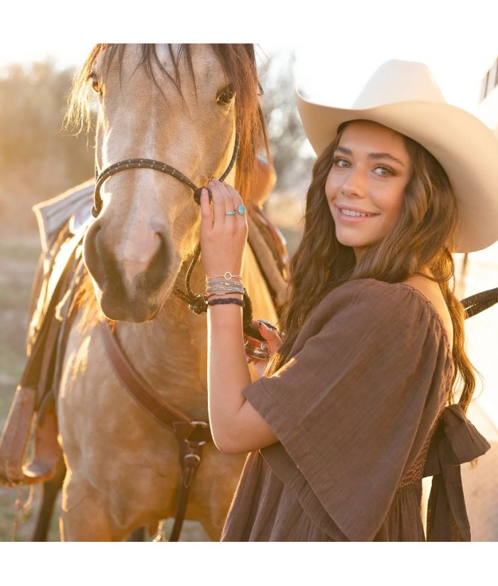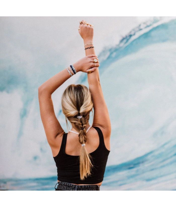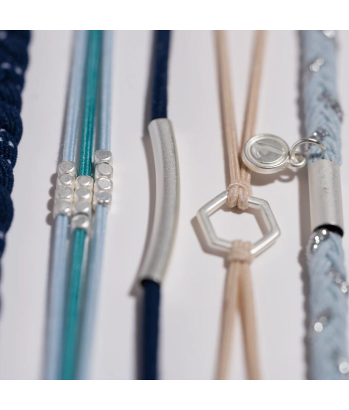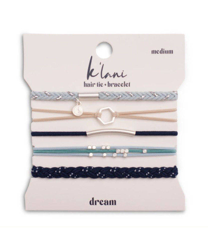 Le coffret DREAM comprend cinq bracelets qui font également office d'élastiques à cheveux, déclinés dans des tons neutres et bleus apaisants, avec une touche d'argent scintillant. Tout dans ce coffret vous invite à respirer profondément et à rêver grand !