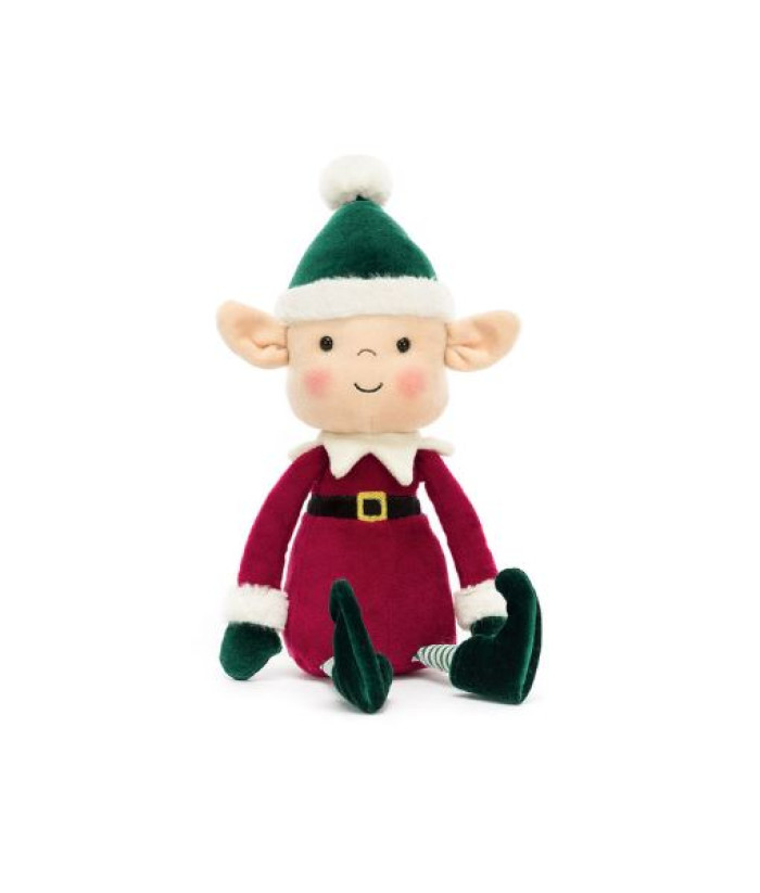 ''Tout le monde a besoin d'un coup de main, pas seulement le Père Noël ! Eldo l'elfe est un ami charmant aux joues roses et aux oreilles délicatement pliées. Ce lutin élégant porte un costume couleur mûre avec un col étoilé crème et une ceinture à boucle dorée, assorti à des bottines en velours bouclé et un bonnet à pompon vert lierre. Avec son sourire affable, Eldo est là pour répandre la magie de Noël !''