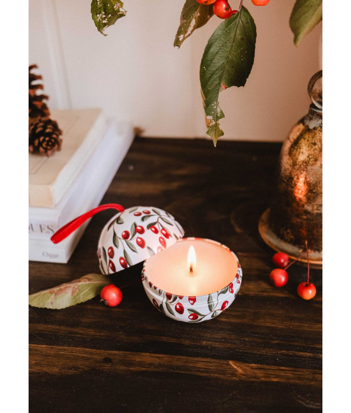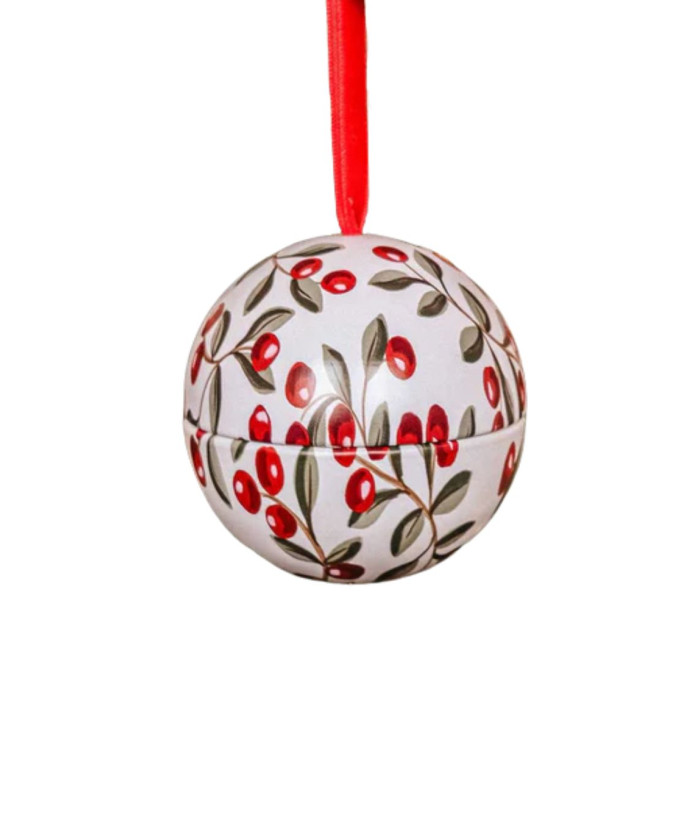 Chaque ornement est joliment illustré de baies rouges et de feuilles vert tendre, parfait pour suspendre à ton sapin ou intégrer à ta déco festive. Une fois la bougie consumée, garde cette jolie boule pour y cacher des friandises, de petits mots ou des souvenirs des Fêtes.